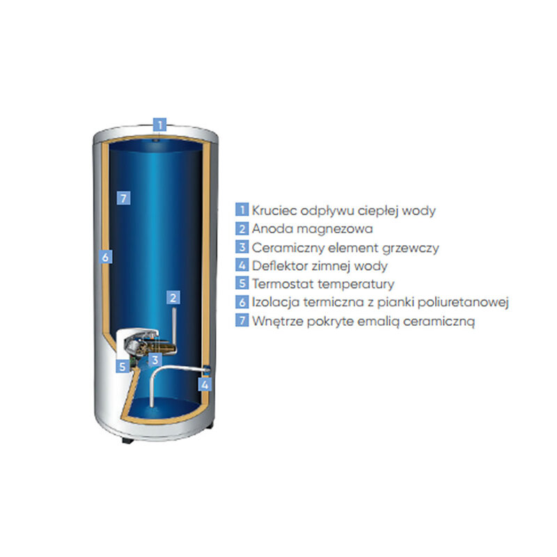 - Podwójna ochrona antykorozyjna, dzięki ceramicznej powłoce zbiornika oraz wymiennej anodzie magnezowej.