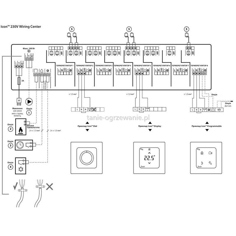 Jest to opcjonalne wyposażenie szafki rozdzielacza do budynków gdzie zostały zamontowane pokojowe termostaty ścienne z serii Danfoss Icon 230V (lub termostaty innego producenta w wersji na 230V).