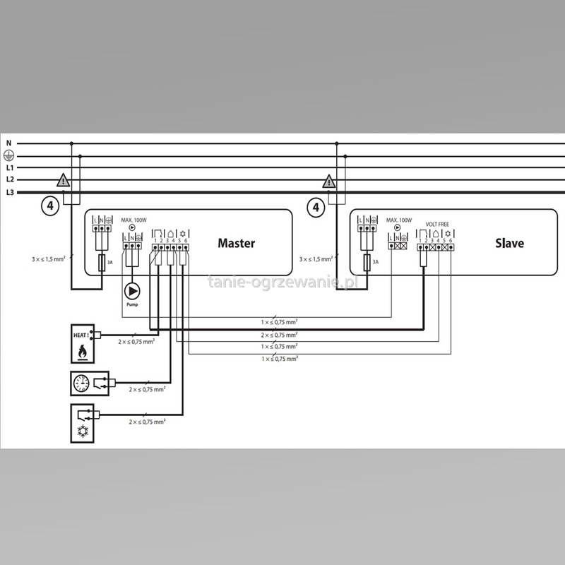 - Obsługa do 8 stref grzewczych (8 pomieszczeń z termostatami) z możliwością rozbudowy o kolejne sterowniki na zasadzie master-slave (ilustracja nr 3)