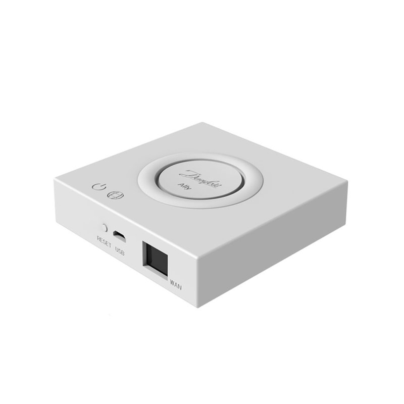 Bramka dostępowa do sieci internetowej dla urządzeń Danfoss Ally. Bramka obsługuje radiowy protokół ZigBee w wersji IEEE 802.15.4 i posiada gniazdo ethernet do podłączenia jej do routera internetowego za pomocą przewodu.