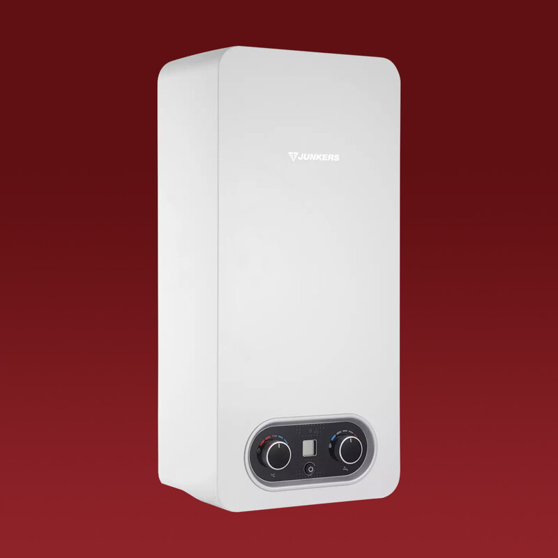 Podgrzewacz wody przepływowy gazowy marki Junkers z serii Hydro 4200 z zapłonem bateryjnym.