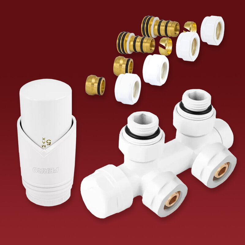 Dekoracyjny zestaw termostatyczny zespolony, kątowy Ferro, biały do grzejników z przyłączem 1/2 cala.