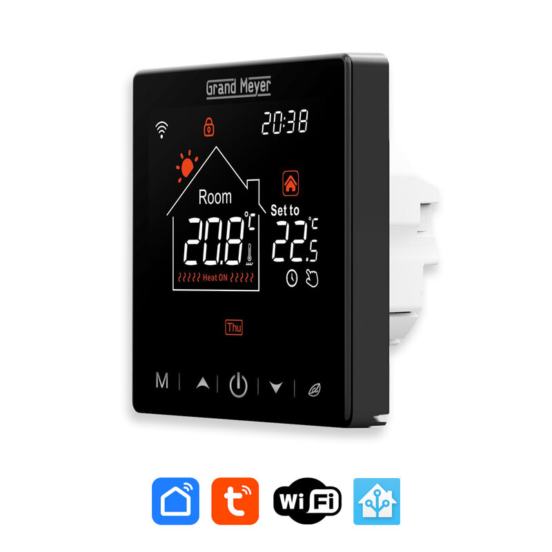 Termostat SN WIFI marki Grand Meyer w wersji przewodowej do ogrzewania grzejnikowego, podłogowego w wersji wodnej i elektrycznej. Jest to termostat internetowy z komunikacją Wifi zgodny z system Tuya, Tuya, eWeLink oraz Home Assistant. Pozwala na zdalną kontrolę temperatur, nastawy oraz wygodne programowanie zegara tygodniowego bezpośrednio z aplikacji w telefonie.