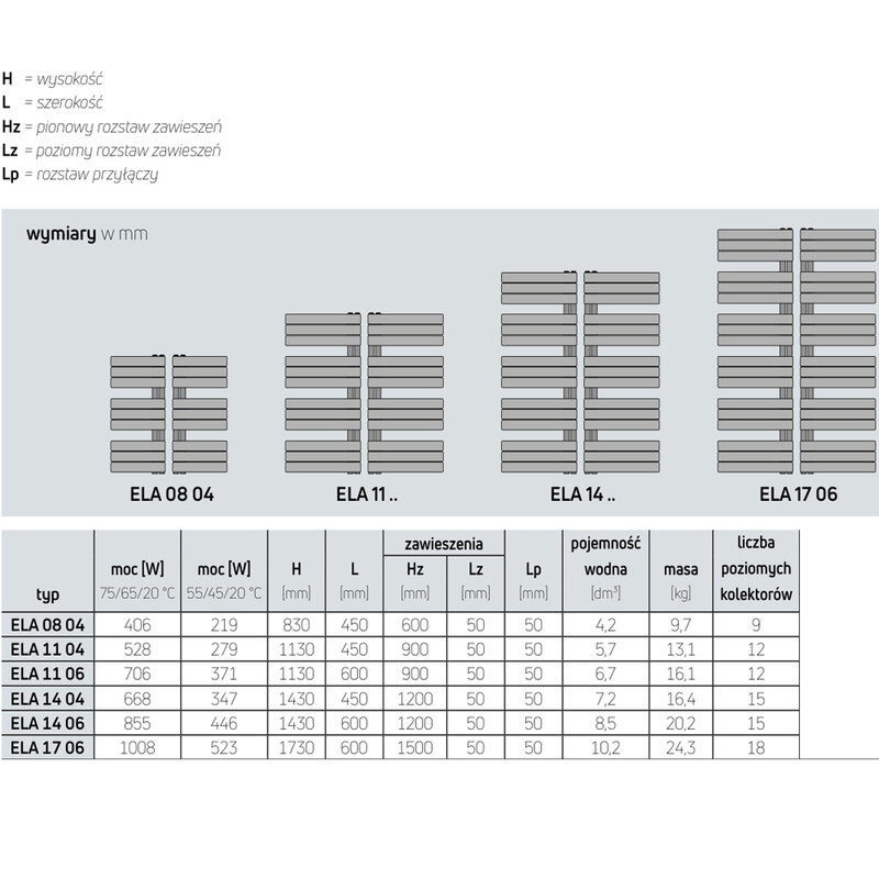 Zdjęcie produktu ma charakter poglądowy. Dokładny układ grzejnika dla każdego rozmiaru oraz dodatkowe informacje techniczne dostępne są w pliku Dokumentacja PDF obok ilustracji.