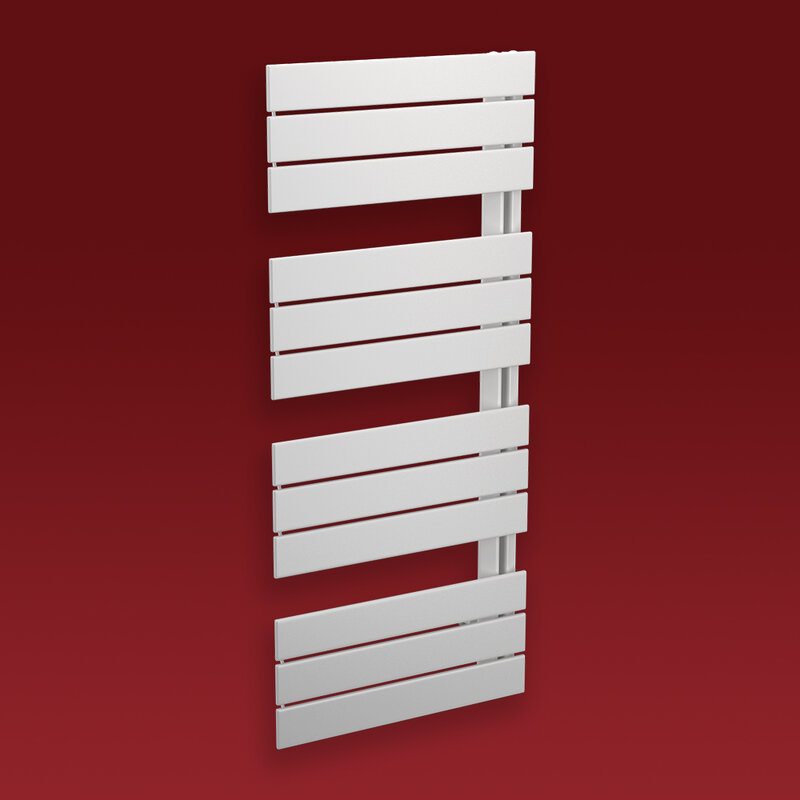 Grzejnik łazienkowy Purmo Elato w formie płaskiej asymetrycznej drabinki składającej się z pionowy kolektorów oraz poziomych płaskich kolektorów. Grzejnik można obrócić tak, aby uzyskać wersję prawą lub lewą z kolektorami pionowymi po określonej stronie.