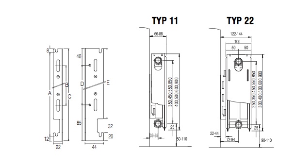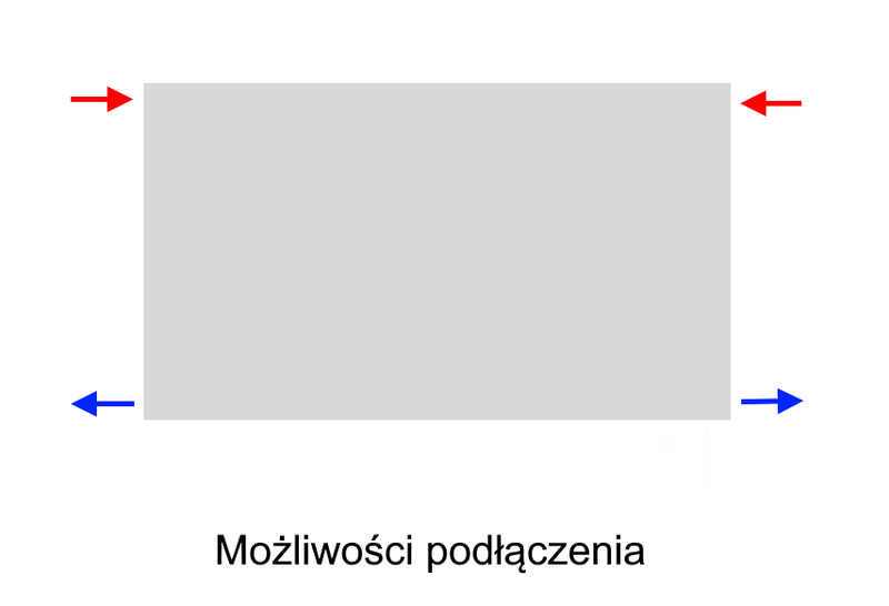 - 4 przyłącza boczne 1/2 cala w rozstawie = wysokość grzejnika - 50 mm