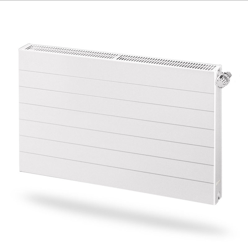 Grzejnik Purmo Ramo z gładką płytą czołową i dekoracyjnymi poziomymi przetłoczeniami. Podłączenie boczne. Grzejnik Ramo C produkowany jest w wysokościach od 300 do 900 mm oraz szerokościach od 400 do 3000 mm.