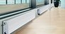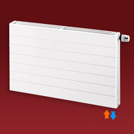 Grzejnik Purmo Ramo z gładką płytą czołową i dekoracyjnymi poziomymi przetłoczeniami. Podłączenie dolne. Grzejnik Ramo CV produkowany jest w wysokościach od 200 do 900 mm oraz szerokościach od 400 do 3000 mm.