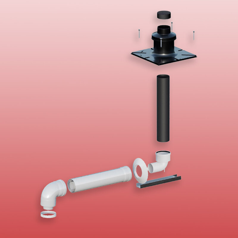 Połączenie kocioł - szacht realizowane jest za pomocą przewodów 60/100mm, kolanko podporowe w szachcie posiada przejście na średnicę 80mm dla pionowej rury w szachcie. Elementy systemu wykonane są polipropylenu dzięki czemu system jest lekki i łatwy w montażu i jest dopuszczony do stosowania w budownictwie jedno i wielorodzinnym na terenie Polski.
