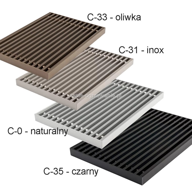 Kratka aluminiowa anodowana do grzejników kanałowych Regulus Duo. Cztery kolory anodowania do wyboru: C-0 naturalny, C-31 inox, C-33 oliwka, C-35 czarny. Kratka zwijana. Rozstaw szczebli 13 mm, szerokość kratki 350 mm, długość 2900 mm.
