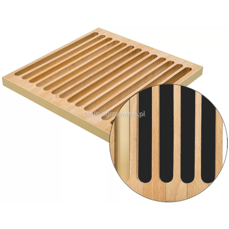 Kratka drewniana bukowa typu bone (kość) do grzejników kanałowych Regulus Triovent, Quattrovent. Rozstaw szczebli 17 mm, szerokość kratki 300 mm, długość 3500 mm. Kratka zwijana.