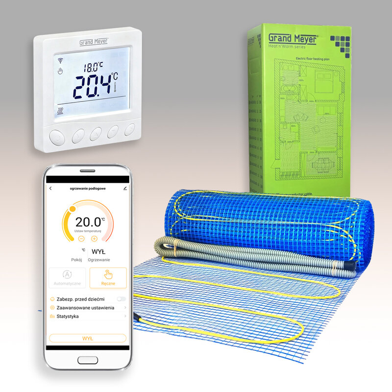 Mata grzewcza pod płytki marki Grand Meyer o mocy 170W/m2 w zestawie z termostatem pokojowym WIFI. Przeznaczona jest do montażu w kleju pod płytki ceramiczne lub w warstwie wylewki samopoziomującej pod podłogi wykończone panelami podłogowymi, itp.