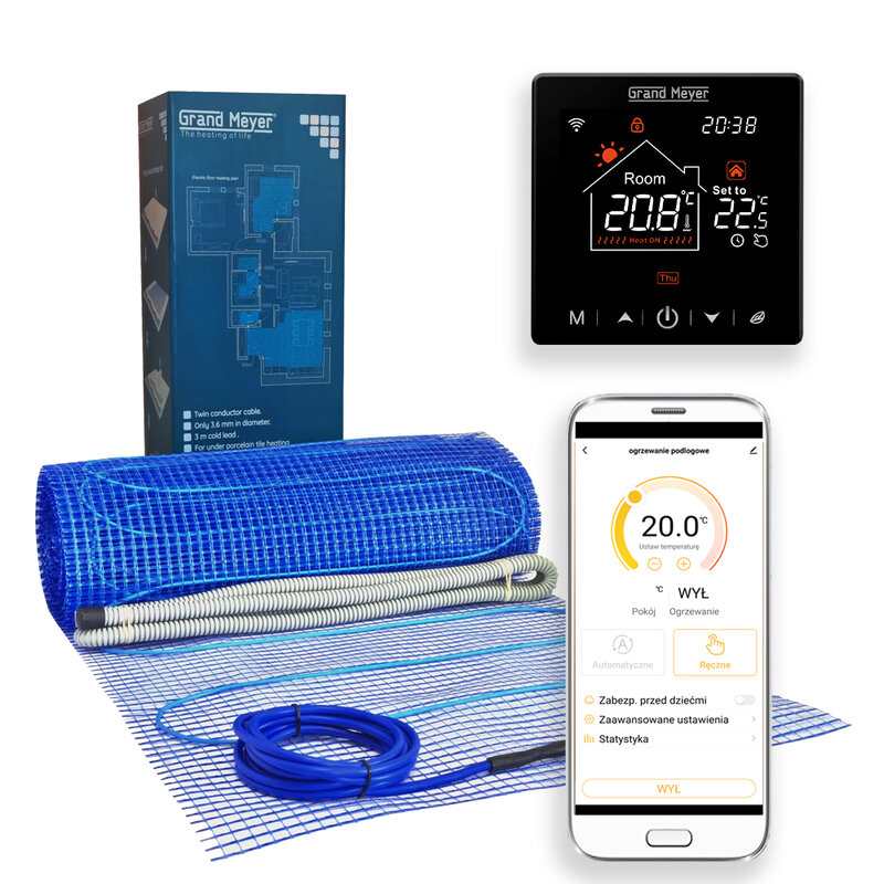 Mata grzewcza marki Grand Meyer o mocy 180W/m2 w zestawie z termostatem pokojowym WiFI. Przeznaczona jest do montażu w kleju pod płytki ceramiczne lub w warstwie wylewki samopoziomującej pod podłogi wykończone panelami podłogowymi, wykładziną itp.