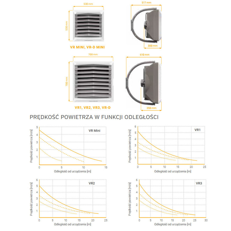 Podane wydajności są szacunkowe. Ostatecznego doboru należy dokonać w oparciu o zapotrzebowanie pomieszczenia na ciepło (W/m2) i tabele wydajności cieplnej nagrzewnicy z dokumentacji technicznej.