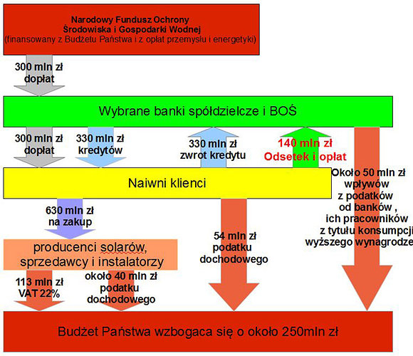 Uruchomiony w ostatnich tygodniach program dopłat do kredytów na kolektory słoneczne tylko z pozoru ma pomóc statystycznemu Kowalskiemu w pozyskaniu ekonomicznego źródła do podgrzewania ciepłej wody użytkowej.Program został tak przygotowany, aby na dopłatach z Narodowego Funduszu Ochrony Środowiska i Gospodarki Wodnej faktyczne korzyści czerpały przede wszystkim banki udzielające kredytów.
