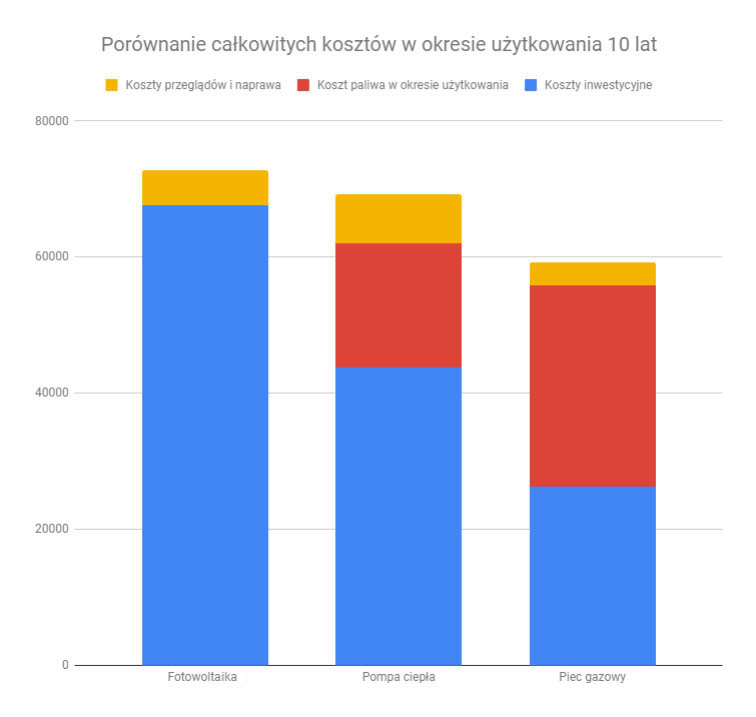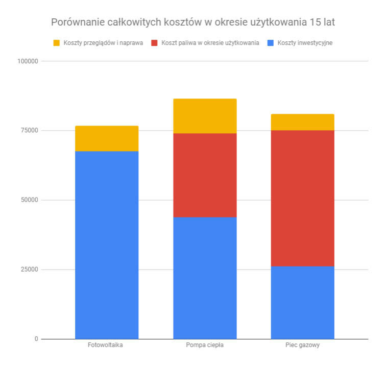 Technologia ogrzewania ciągle się rozwija, ceny wielu nowych rozwiązań spadają i przed naszymi klientami często pojawia się pytanie: na jaką technologię ogrzewania domu postawić? Nasi klienci, widząc ogromną różnorodność naszej oferty, w ostatnim czasie coraz częściej zadają pytanie w sprawie porównania opłacalności inwestycji w fotowoltaikę w stosunku do pompy ciepła oraz kotła gazowego, dlatego postanowiliśmy policzyć co jest bardziej opłacalne. Wzięliśmy pod uwagę zarówno główne koszty inwestycyjne, jak i koszty użytkowania (paliwa), a także przeglądów i napraw.