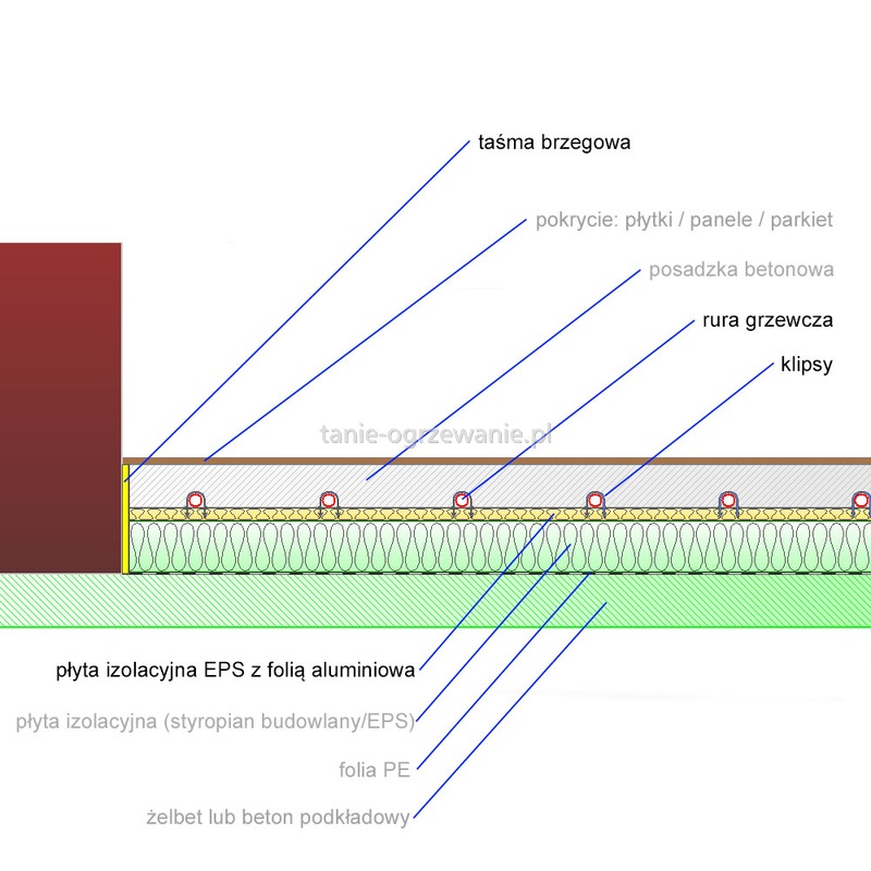 - Gęstość układania co 20 cm dla pomieszczeń użytkowych oraz 10 lub 15 cm dla łazienek i pomieszczeń gdzie wymagana jest podwyższona temperatura (24 st. C)