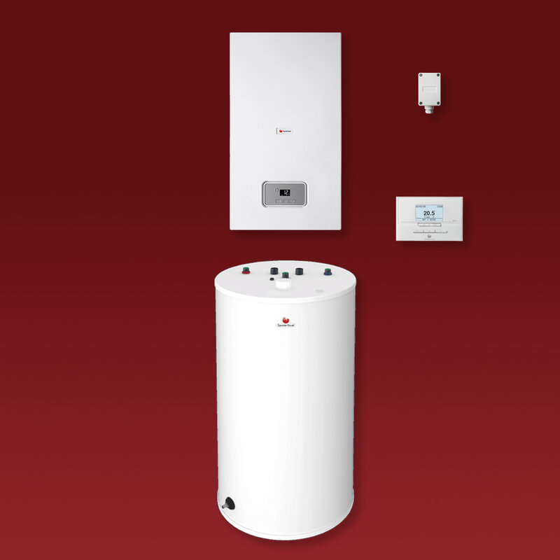 Pakiet składający się z kondensacyjnego pieca wiszącego oraz stojącego zasobnika ciepłej wody użytkowej.