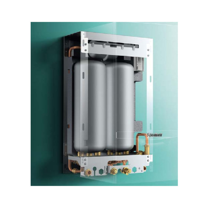 Zestaw zasobników o pojemności 20 litrów jest zintegrowany z kotłem w postaci modułu zamontowanego "za" piecem. Przez co piec ma nieco większą głębokość w stosunku do kotłów Vaillant VCW.