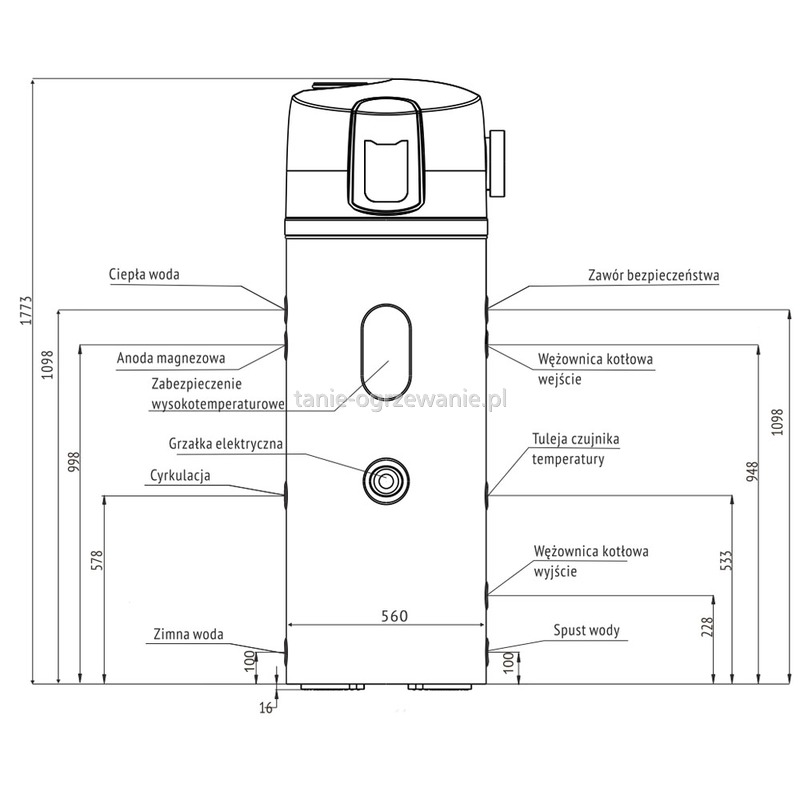 - wbudowana grzałka elektryczna pozwala zwiększyć szybkość podgrzewania w sytuacjach bardzo dużego poboru ciepłej wody, oraz zapewnia dezynfekcje zasobnika podnosząc temperaturę powyżej 70 st.C.