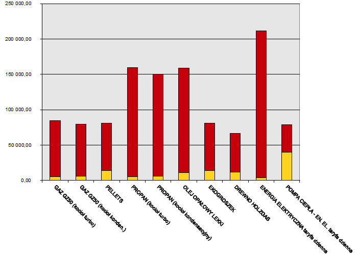 Ponieważ na koszt ogrzewania wpływ ma także zakup sprzętu, który nie jest wieczny, porównanie obejmuje koszty nośników energii (paliwa) oraz zakup wyposażenia kotłowni za czas użytkowania 15 lat.