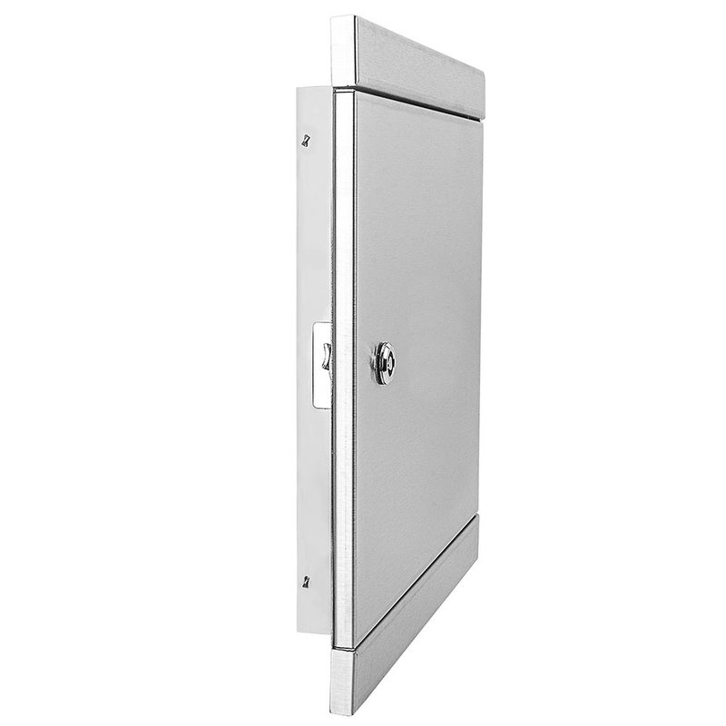 Drzwiczki rewizyjne uniwersalne marki Telbox. Wykonane są z blachy nierdzewnej. Dzięki zastosowaniu blachy o grubości 0,8mm, konstrukcja drzwi i ramy jest sztywna, co ułatwia osadzenie drzwi w ścianie. Drzwi wyposażone są w zamek zabezpieczający przed dostępem przez osoby niepowołane, a jednocześnie gwarantuje możliwość prowadzenia prac serwisowych i przeglądów przez ekipy techniczne. Klucz do zamka wchodzi w zakres dostawy.Drzwi rewizyjne wraz z ramą są wykonane ze stali nierdzewnej, co gwarantuje żywotność i pełną odporność na korozje i warunki atmosferyczne.