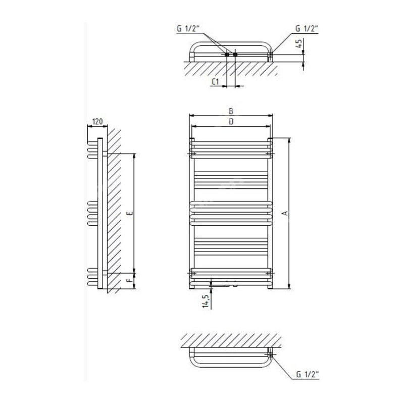 Grzejnik łazienkowy Onnline PBM wykonany jest w formie symetrycznej drabinki. Dwie pionowe kolumny o przekroju kwadratowym połączone są poziomymi okrągłymi rurkami o średnicy 22mm. Rurki te wygięte są w kształt litery U łączone w grupy i przeplatają się z poziomymi rurkami prostymi także grupowanymi. Głębokość grzejnika z uchwytami ściennymi wynosi 120 mm.