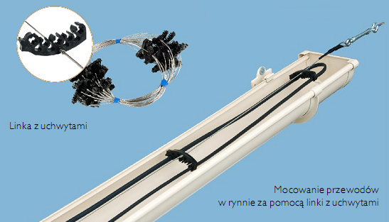Linka stalowa z uchwytami z tworzywa do mocowania przewodów grzejnych w rynnach. Linki powinny być zamocowane trwale do kołków lub kotw pewnie umocowanych w ścianie, murku ogniowym lub elemencie nośnym dachu.