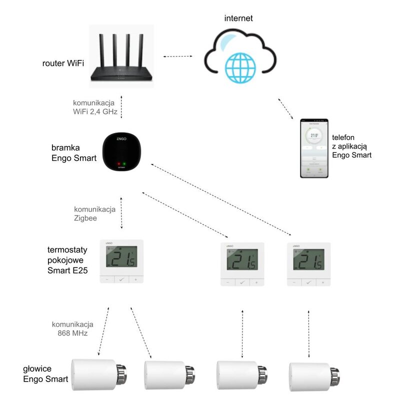 - zdalne sterowanie przez internet - wymaga termostatu naściennego Engo Smart E25 i bramki