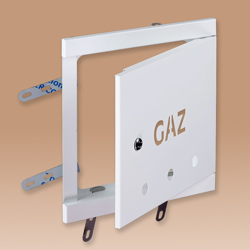 Drzwi rewizyjne do zaworu gazu polskiej marki Telbox. Wykonane są z blachy stalowej ocynkowanej. Dzięki zastosowaniu blachy o grubości 0,8mm, konstrukcja drzwi i ramy jest sztywna, co ułatwia osadzenie drzwi w ścianie. Drzwi spełniają wymagania polskich