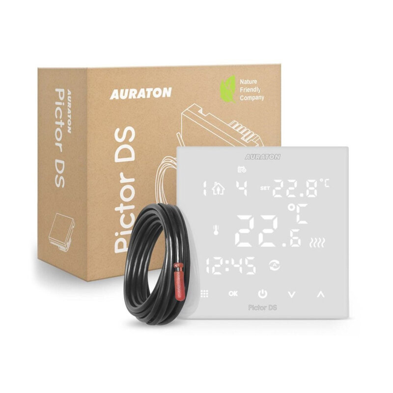 Termostat przewodowy Pictor DS firmy marki Auraton do sterowania ogrzewaniem grzejnikowym C.O., kotłami i pompami obiegowymi.