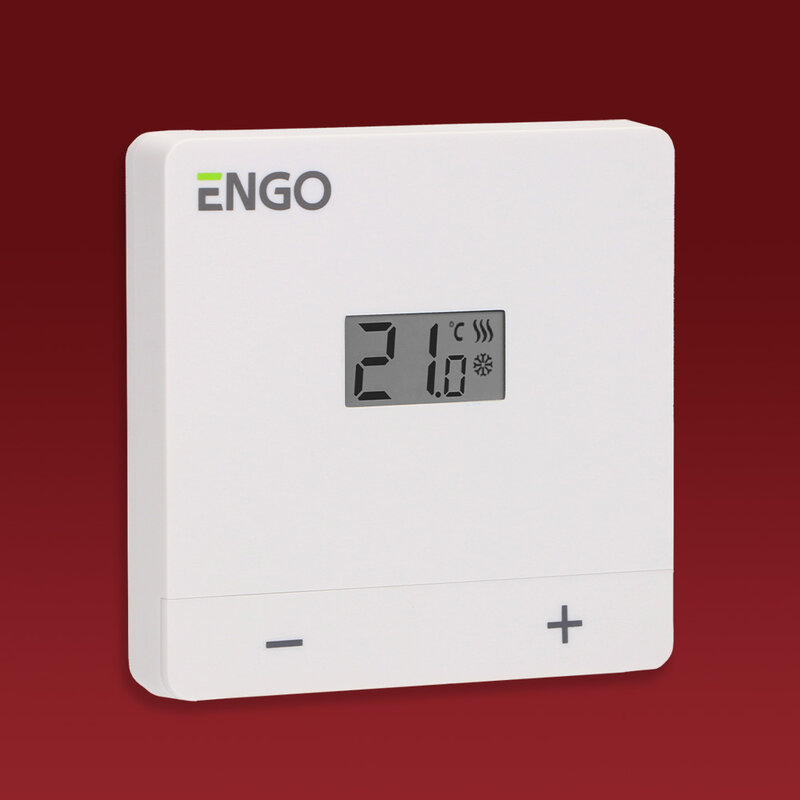 Regulator temperatury pokojowy marki Engo z serii Easy w wersji przewodowej z zasilanie bateryjnym.