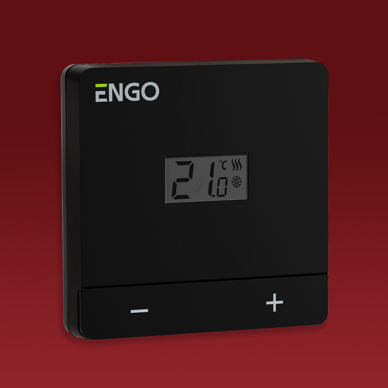 Regulator temperatury pokojowy marki Engo z serii Easy w wersji przewodowej z zasilanie bateryjnym.